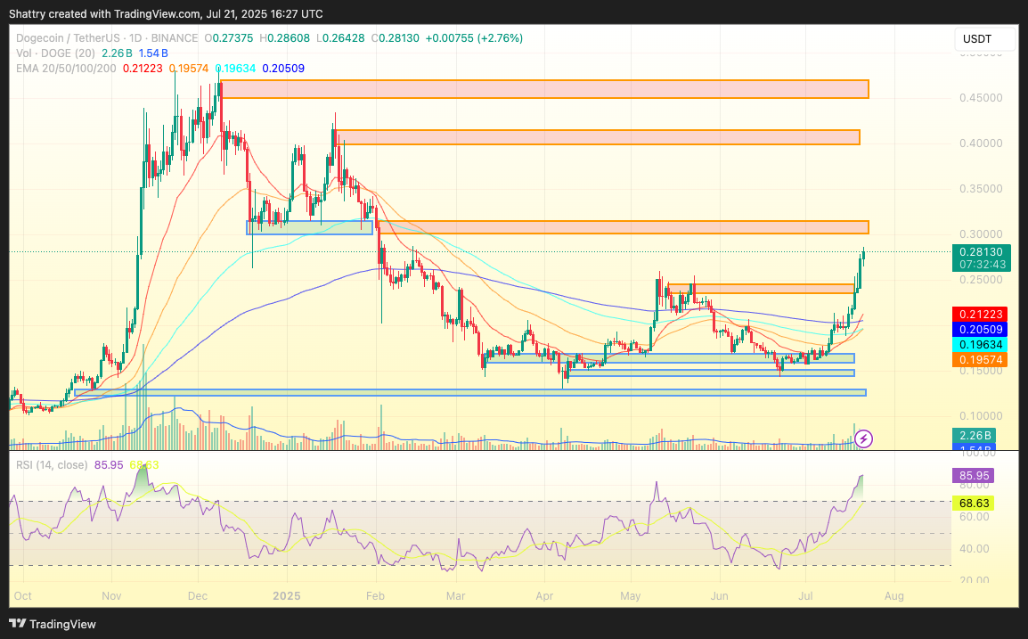 The extreme RSI at 85.95 creates a binary outcome, where DOGE either achieves a decisive breakout above $0.30, targeting $0.45+, or experiences a healthy correction to reset technical indicators.