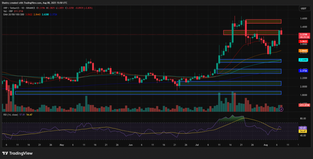 Moving averages reveal an exceptional bullish structure with XRP above all major EMAs: 20-day at $3.06 (-5.1%), 50-day at $2.84 (-11.8%), 100-day at $2.63 (-18.5%), and 200-day at $2.37 (-26.4%).