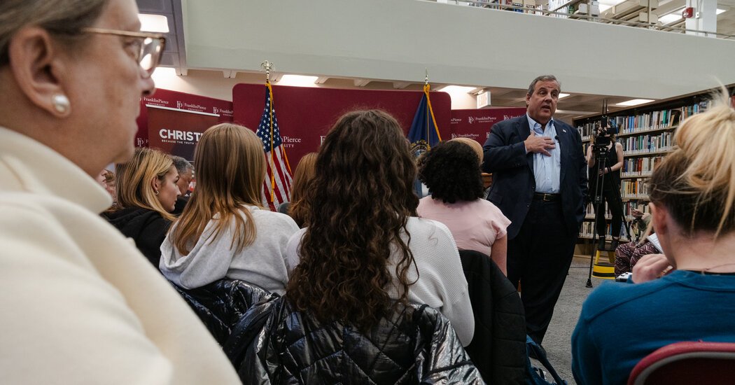 Speaking to students at Keene State College in the western part of the state, Mr. Christie recounted with visible glee a shouting match with Mr. DeSantis, who dodged a question on Mr. Trump’s fitness to be president. Mr. DeSantis, he implied, was eager to quickly move past the question. Mr. Christie said that he wouldn’t allow it.