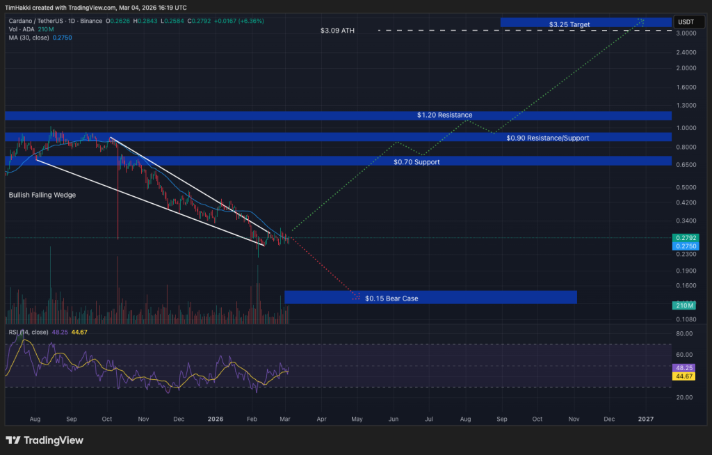 Claude’s outlook suggests ADA could rise by more than 1,-00%, climbing from roughly $0.28 today to nearly $3.25 by Christmas. That would surpass its previous peak of $3.09 set in 2021.