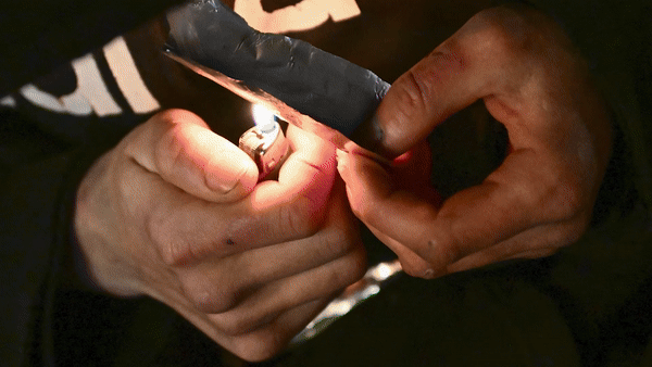 A person smokes a foil of fentanyl on Park Avenue in downtown Portland, Oregon on Jan. 23, 2024. Possession of user amounts of all drugs became decriminalized in the state in February 2021 after voters approved Measure 110. The first-in-the-nation law turned possession into a Class E violation, punishable by a $100 fine. Selling and manufacturing drugs remains illegal. (Patrick T. Fallon/AFP via Getty Images)