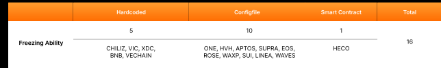 Another five networks, including BNB Chain, embed freezing features in their source code, allowing blacklisted wallets to be blocked at the protocol level.