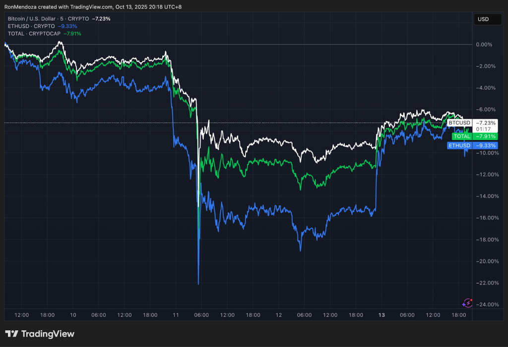 Bitcoin (BTC) fell 7.8% in a single day, dropping from $122,582 to below $110,000, while Ethereum (ETH) saw an even steeper decline of 12.33%, plunging from $4,368 to lows of $3,435 on October 10.