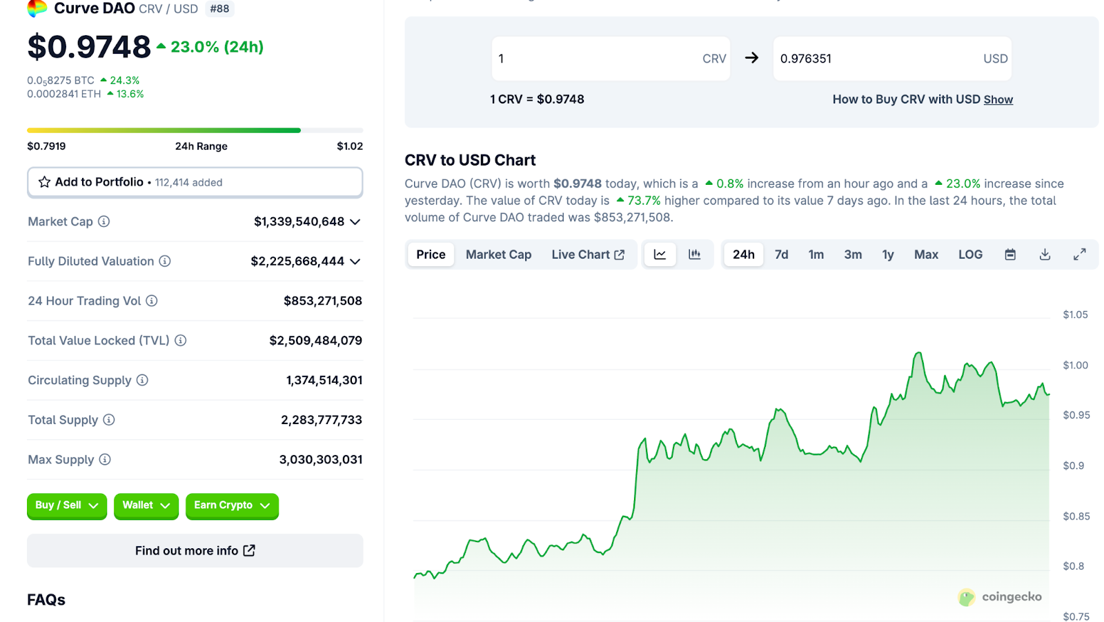 Curve DAO’s native token $CRV rebounded this week, with about a 79% rally as it climbed from a weekly low of $0.6017 and is trading at $0.9882 at press time, also marking a 22.9% increase in the last 24 hours.