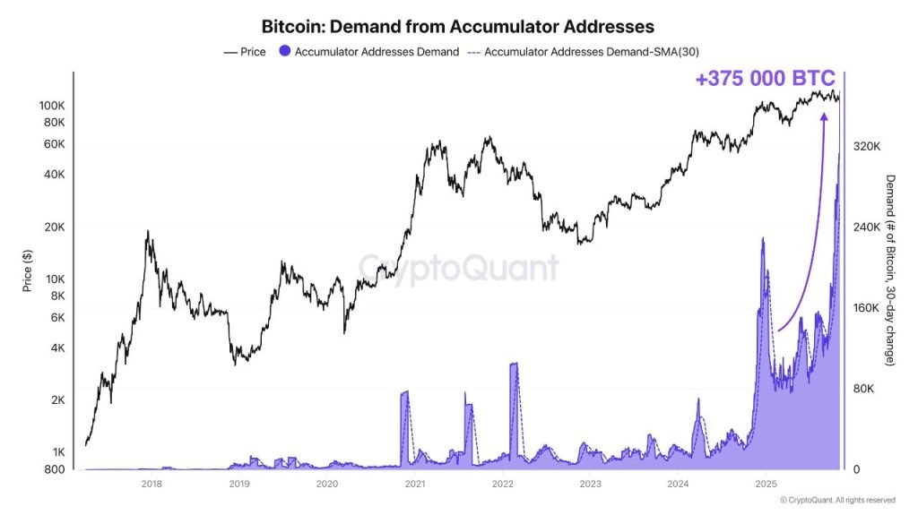 Bitcoin accumulator addresses just set a new all-time high by purchasing over 375,000 BTC in 30 days, with more than 50,000 BTC added yesterday alone, according to CryptoQuant analysis.