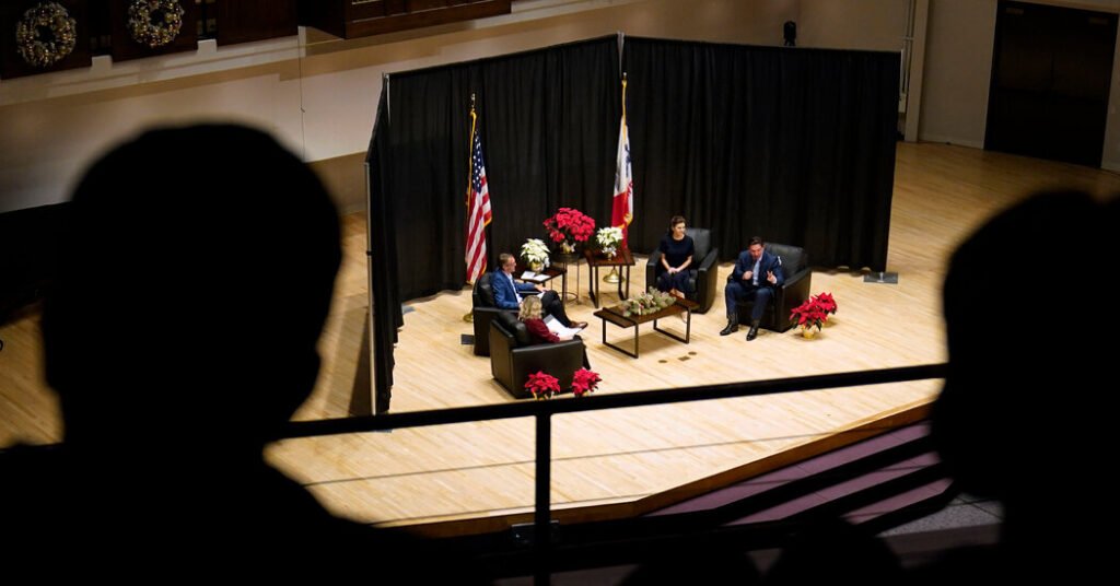 The candidates came to this town of just over 8,000 people on a snow-dusted plain in rural northwestern Iowa, fewer than 40 miles from South Dakota, to pitch themselves to the area’s conservative voters and to seek the endorsement of Representative Randy Feenstra, the region’s popular Republican congressman. Mr. Feenstra and his wife interviewed each candidate in front of about 400 community members and college students at the B.J. Haan Auditorium, where banners read “Glory to God Alone.”