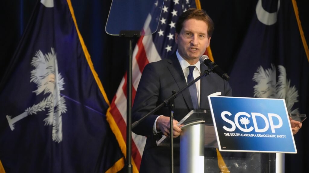 U.S. Rep. Dean Phillips, D-Minnesota, speaks at the South Carolina Democratic Party’s First-in-the-Nation Dinner, Saturday, Jan. 27, 2024, in Columbia, S.C. Phillips is challenging President Joe Biden, the dinner’s keynote speaker, for this year’s Democratic presidential nomination. (AP Photo/Meg Kinnard) (AP Photo/Meg Kinnard)