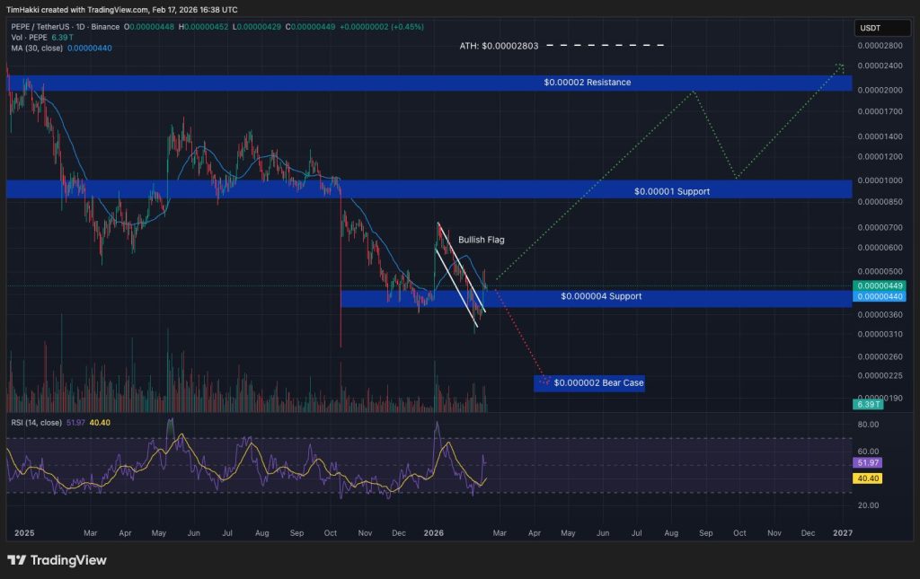 PEPE is currently priced around $0.000004444, roughly 84% below its December 2024 peak of $0.00002803.