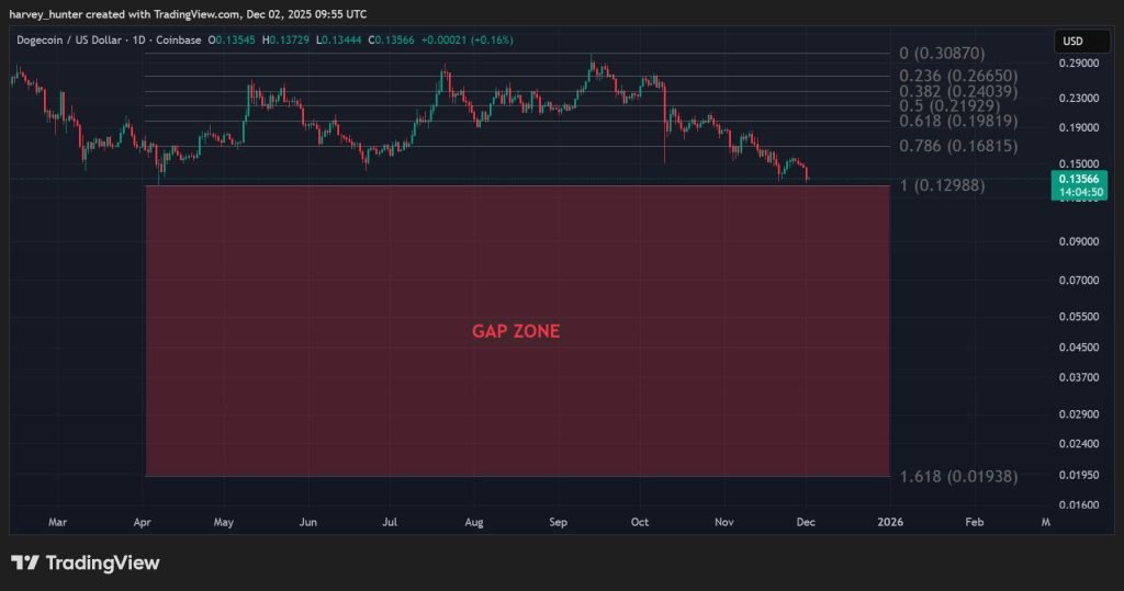 A decisive close beneath $0.13 would expose Dogecoin to the deeper 1.618 Fib extension around $0.02, an 85% drop from current prices.