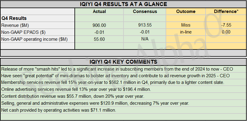 Share Facebook Twitter LinkedIn Pinterest Email Earnings Snapshot: iQIYI misses Q4 top-line estimates, membership services revenue drops 15%