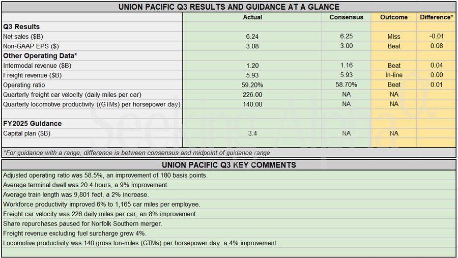 Earnings Snapshot: Union Pacific beats Q3 bottom-line estimates, misses on revenue; reaffirms FY25 outlook