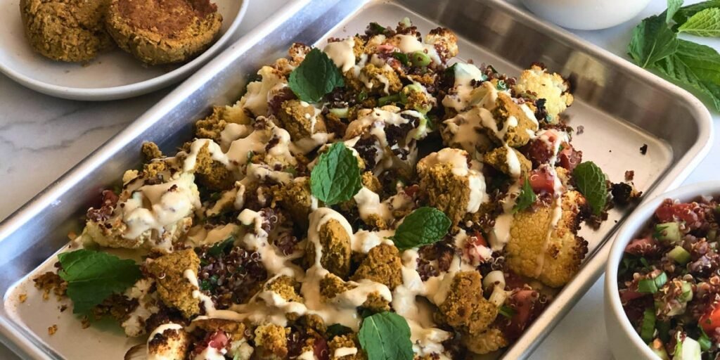 Instead of chips, I toss cauliflower florets with olive oil, Green Goddess seasoning, oregano, salt, and pepper. I spread them on a pan with frozen falafel and roast at 400°F for 15 minutes.