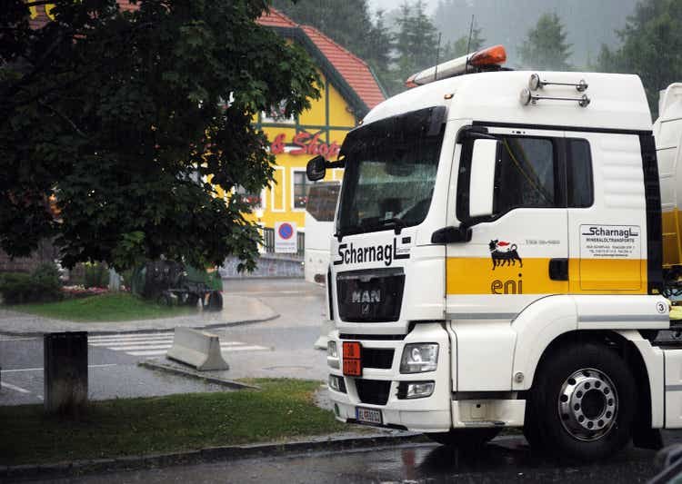 ENI fuel and gas station. Eni S.p.A. is an Italian multinational oil and gas company headquartered in Rome. MAN truck with the ENI logo.
