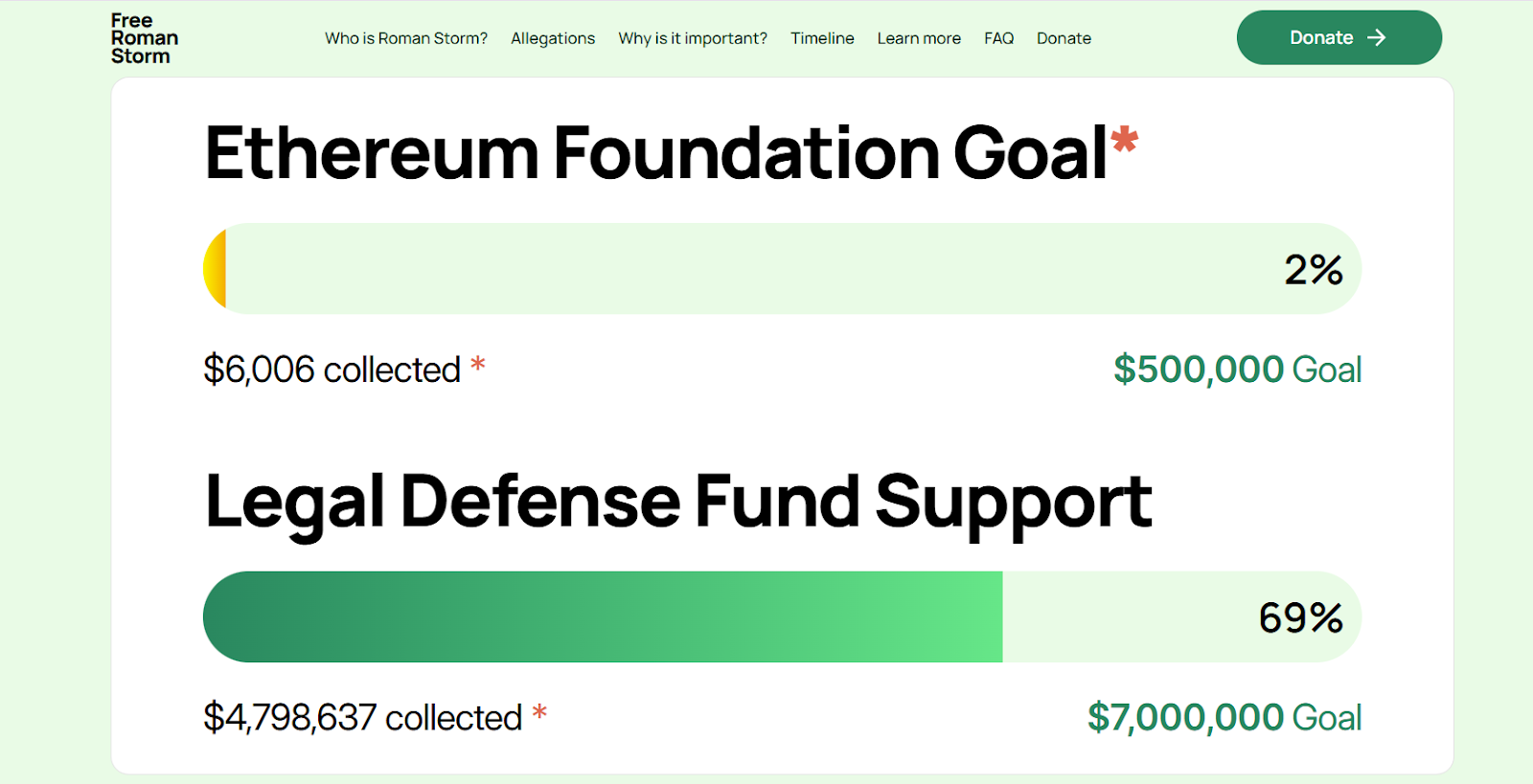 According to the “freeromanstorm” donation tracker, the Ethereum Foundation has contributed only 2% of the $500,000 target, while total legal fund support received by the Tornado Cash developer currently exceeds $4.7 million, still 31% short of the ambitious $7 million goal.