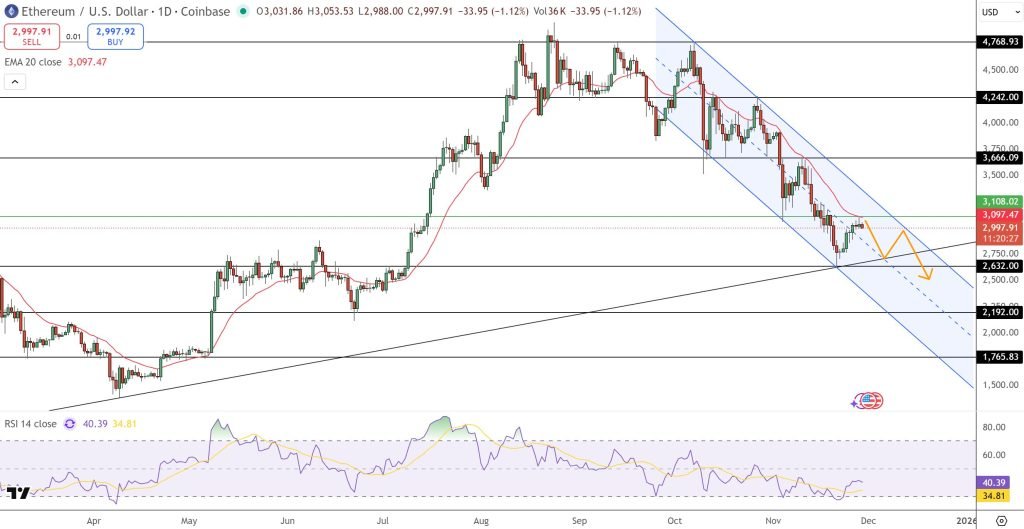 Ethereum’s daily chart shows the market moving inside a clear descending channel, a structure that has shaped every rebound since mid-October. The latest rejection at $3,108, just under the 20-day EMA, highlights the strength of short-term resistance.