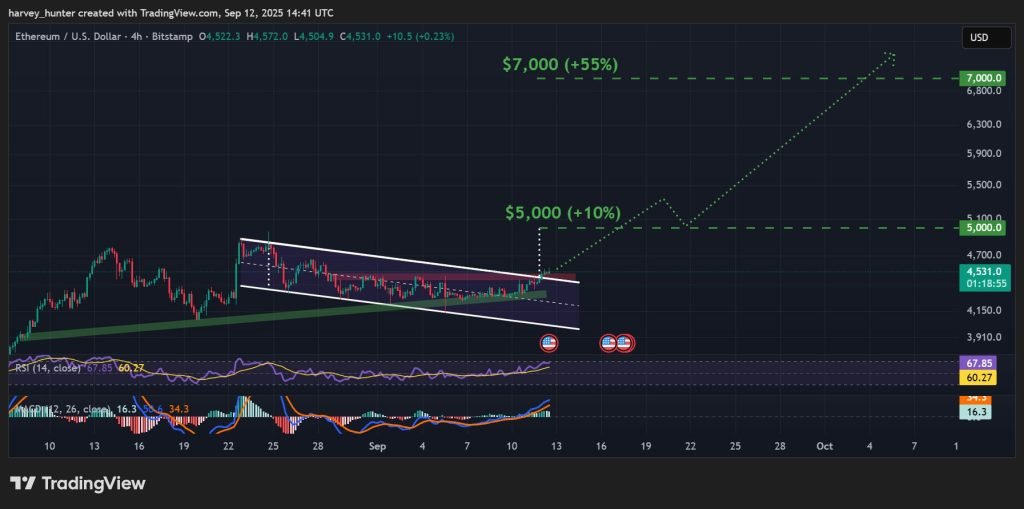 A stronger rally, underpinned by up to 75 bps in U.S. rate cuts before year-end, could extend the Ethereum price toward $7,000—a 55% gain from current levels.