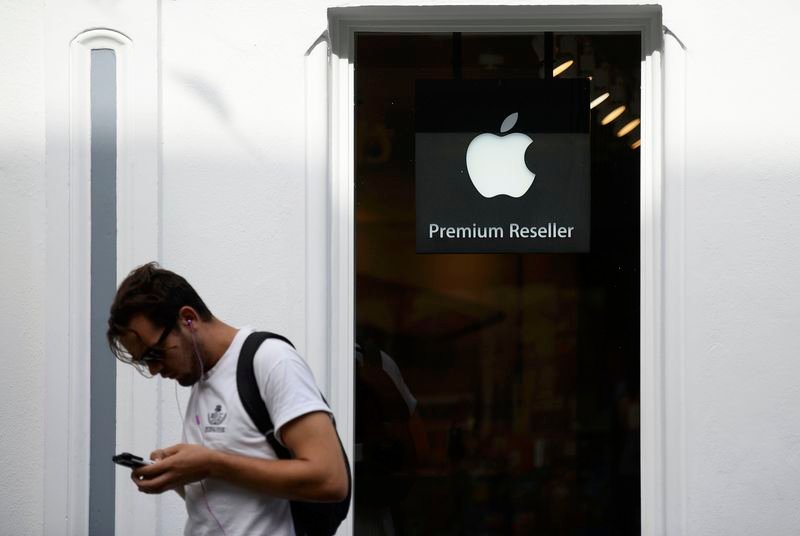 © Reuters. FILE PHOTO: The Apple logo is seen hanging at the entrance to the Apple store on 5th Avenue in Manhattan, New York, U.S., October 16, 2019. REUTERS/Mike Segar/File Photo