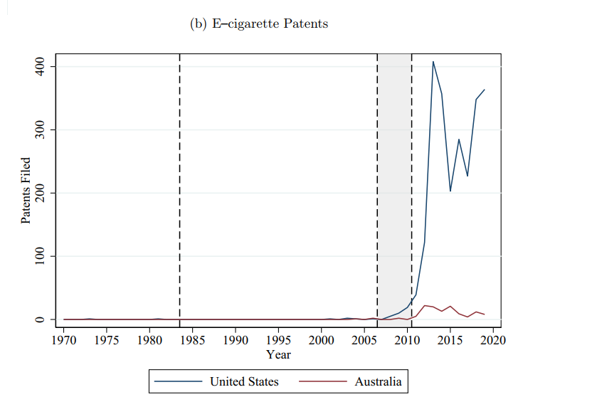 The boom in research and development is evidenced by a very large increase in US e-cigarette patents. We do not see a similar increase in Australia (where e-cigarettes were not deregulated) nor do we see an increase in non e-cigarette smoking cessation products (figure 1a of their paper not shown here).