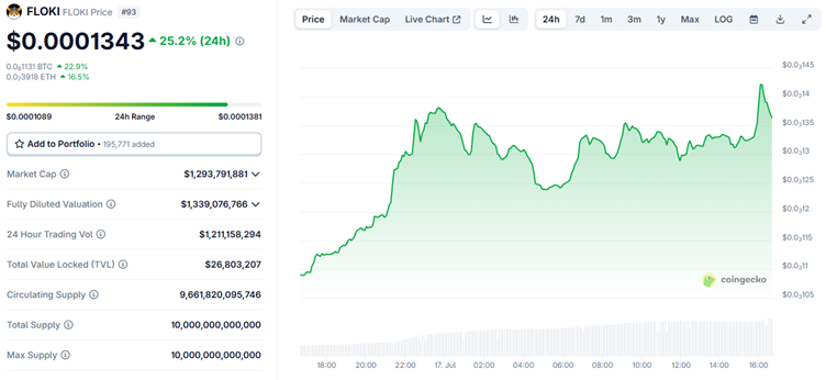 Floki ($FLOKI) is on a positive trajectory as it rallied 22.2% in a day to change hands at $0.0001343, reflecting renewed strength in the broader meme coin sector as it surpassed its $0.0001 target.