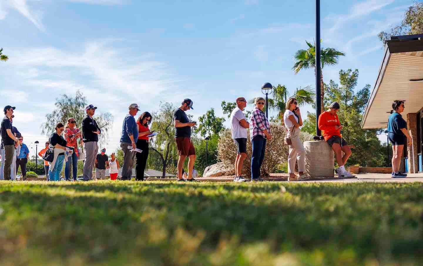 Arizona residents wait in line to vote early at the Indian Bend Wash Visitor Center on October 30, 2024,, in Scottsdale, Arizona.