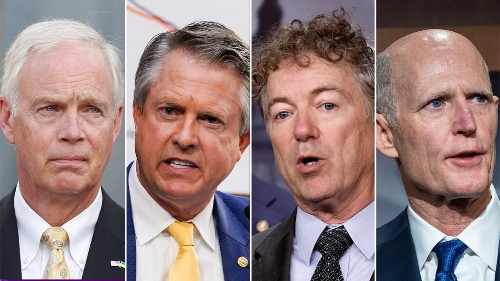 From left to right, Republican Sens. Ron Johnson, Roger Marshall, Rand Paul and Rick Scott. (STR/NurPhoto/Susan Walsh-Pool/Anna Moneymaker/Graeme Sloan/Bloomberg)
