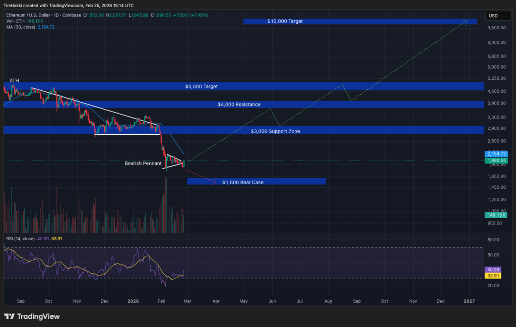 ETH currently trades around $2,000, with significant resistance expected near $5,000 after setting an all-time high of $4,946.05 last August.