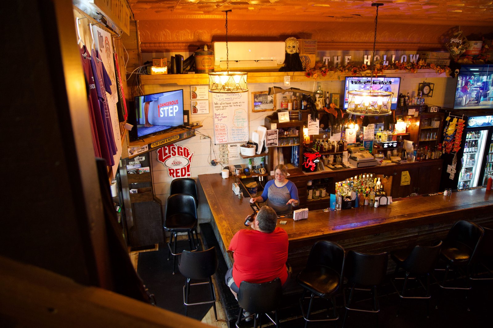 A bartender and patron chat at The Hollow Bar & Grill in Montfort, Wisconsin, on Oct. 10. The sports bar is one of few businesses in the small town.