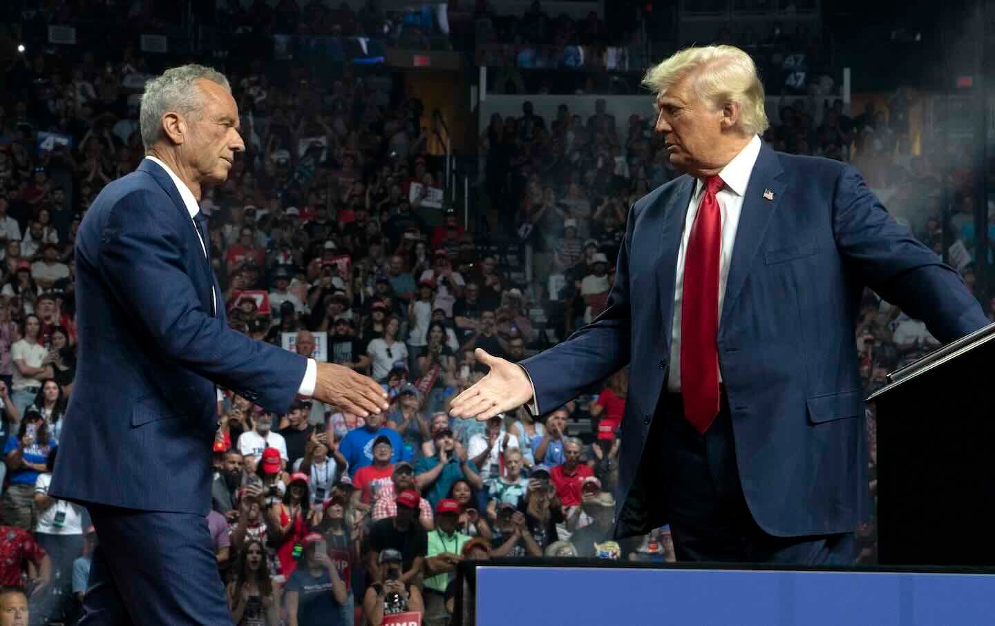 Robert F. Kennedy Jr. and President Donald Trump shake hands during a campaign rally at Desert Diamond Arena on August 23, 2024, in Glendale, Arizona.