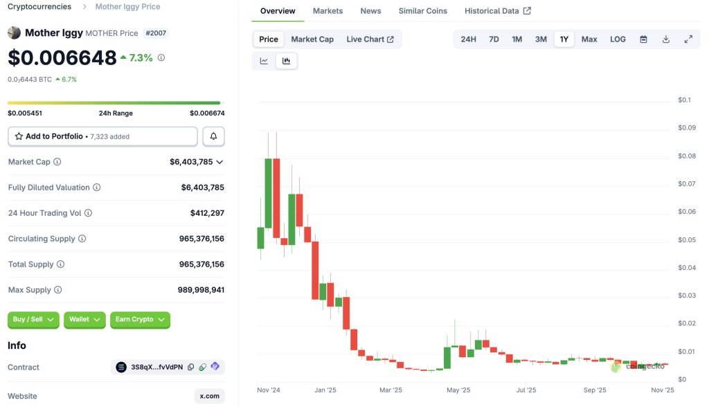 Despite the setback, MOTHER has remained active, currently trading at $0.00659, up 5% in 24 hours, with a market cap of around $6.3 million, according to CoinGecko.