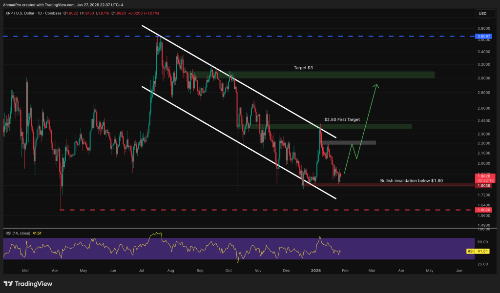 As long as XRP holds above $1.80, this move looks like a short-term recovery attempt rather than a breakdown. The first real hurdle for bulls sits around $2.30–$2.50, where price has repeatedly rejected and where the upper channel resistance lines up.