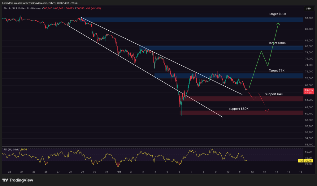 Below, $64,000 is the first floor to watch, and if that gives way, all eyes snap straight to $60,000.