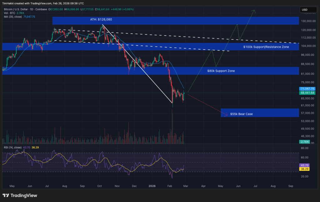 Clear that, and price discovery mode begins. However, if the broader crypto market weakens, a retest of $62,000 and the threat of a collapse down to $55k hang ominously over the industry.