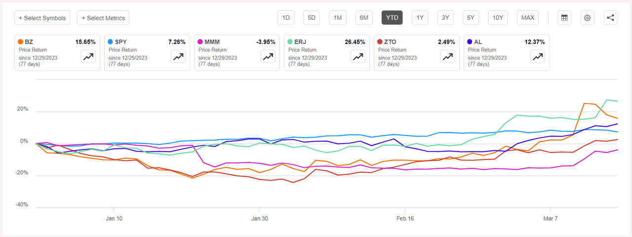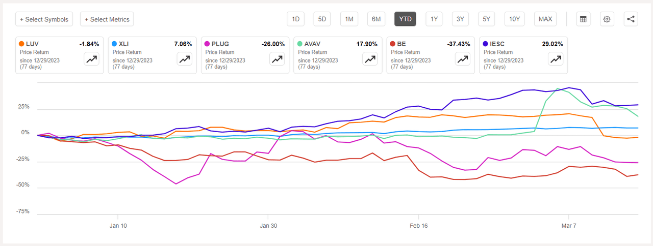 The chart below shows YTD price-return performance of the worst five decliners and XLI: