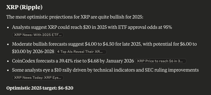 Claude predicts that Ripple’s cross-border payments leader XRP (XRP), could soar to $20 by the end of 2025, marking a more than sixfold rise from its present value of approximately $3.22.
