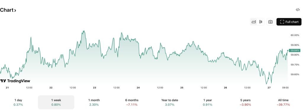 Bitcoin dominance stands near 59%, indicating most liquidity remains centered on primary assets. The pattern shows investors favoring security over risk exposure, while inflows into mid-cap altcoins have yet to materialize.
