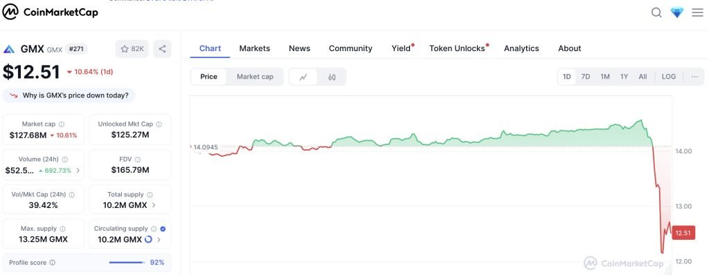 The GMX token (GMX) saw a sharp drop in price down to $12.51 at press time following the initial reports, reflecting market uncertainty around the scope and resolution of the exploit.