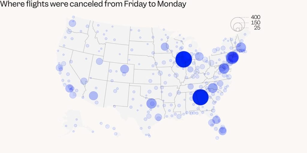 You can hover over each icon to view the name of the airport and the number of flights canceled there, according to Cirium’s data.