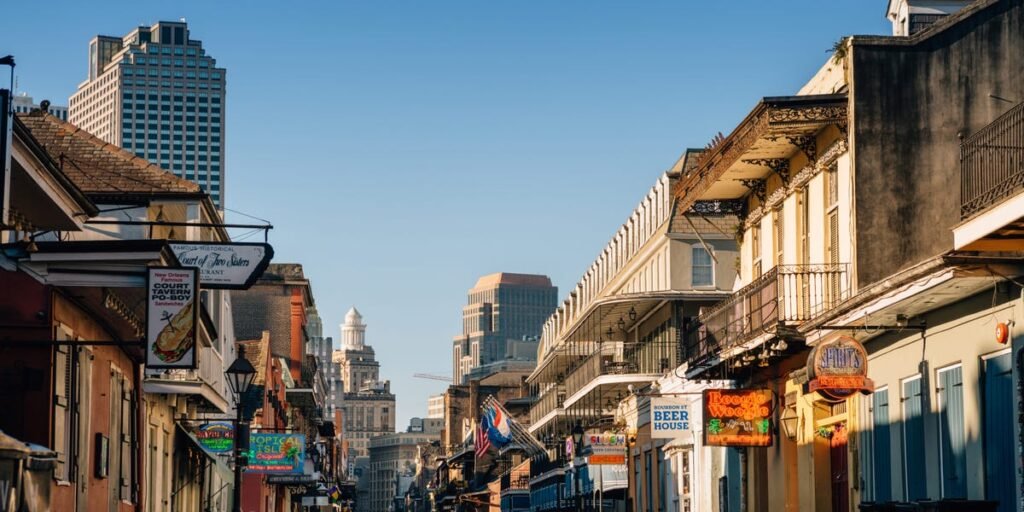 Bourbon Street, in the city’s French Quarter, is a famous party destination known for drinking and revelry.
