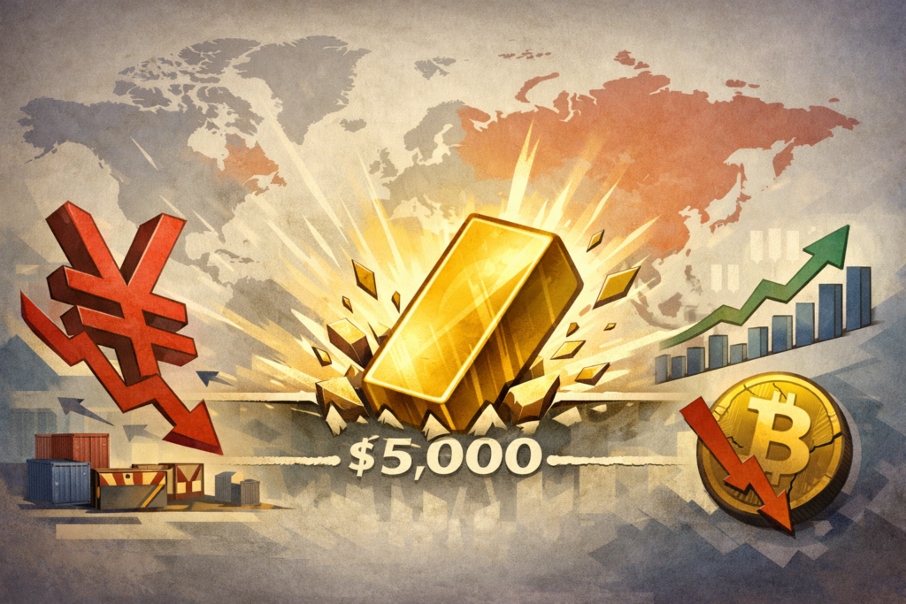 Gold surged to fresh record highs above $5,000 an ounce, buoyed by safe-haven demand and a weaker dollar, while sharp swings in the Japanese yen reignited speculation over possible currency intervention.