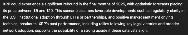 ChatGPT’s predictive models indicate that Ripple’s XRP ($XRP) could rank among the top-performing assets in the final months of 2025, with projections suggesting a rise to between $5 and $10, a gain of up to 350% from its current level near $2.23.