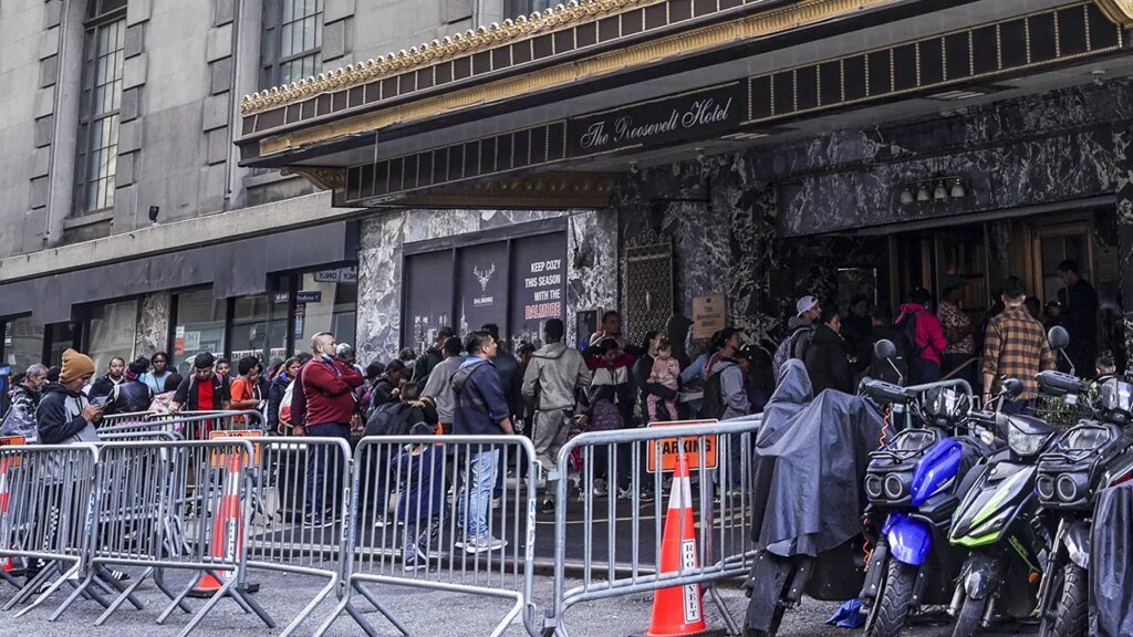 Asylum seekers line up in front of the historic Roosevelt Hotel, converted into a city-run shelter for newly arrived migrant families in New York City, United States on September 27, 2023. (Selcuk Acar/Anadolu Agency via Getty Images)