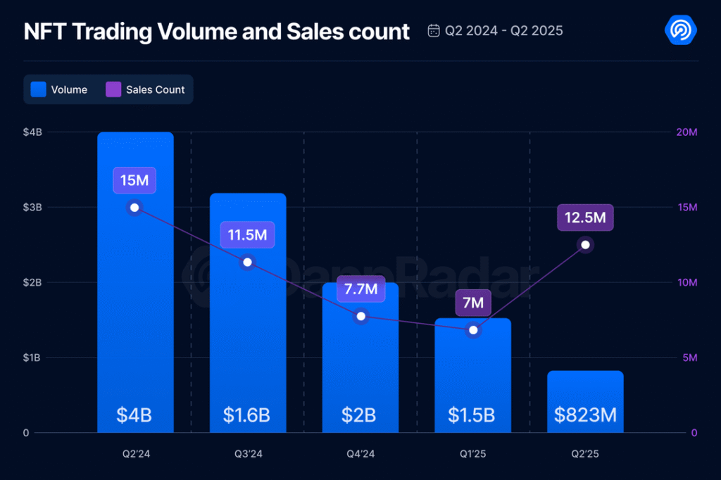 NFT trading volumes plummeted for the fifth consecutive quarter, declining 80% to $823 million in Q2 2025 from $4 billion during the prior-year period, according to DappRadar data.