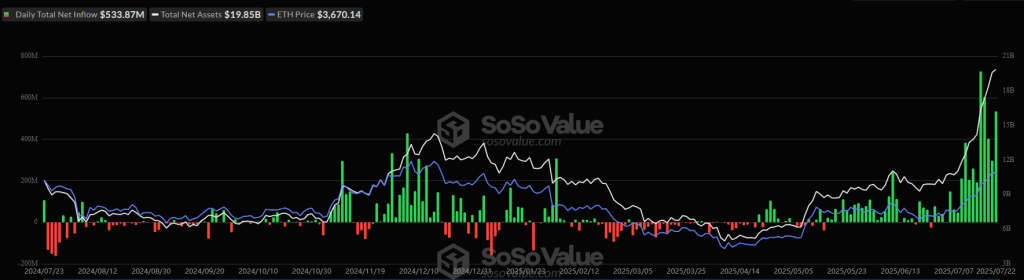 On 23 July 2025, closing with the trading on 22 July, the total net inflow into these funds has reached $8.32 billion.