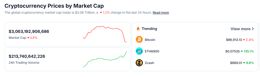 According to CoinGecko data, total market capitalization dropped 2% in 24 hours to $3.08 trillion, with high but fading trading activity at $202 billion.