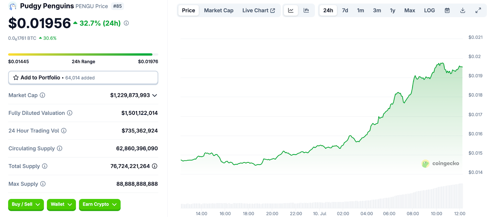 Pudgy Penguins ($PENGU) rocketed about 33% in 24 hours to trade at $0.01959 after it rebounded from a $0.01445 intraday low.