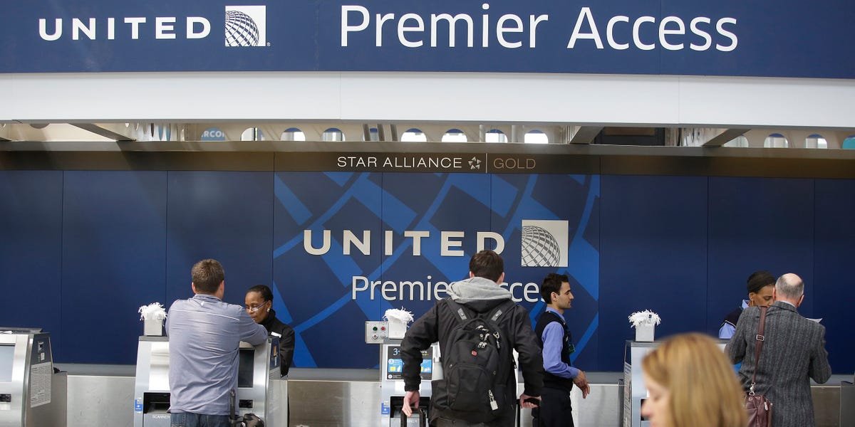 Travelers checking in at United Airlines' Premier Access desk at Chicago's O'Hare Airport.