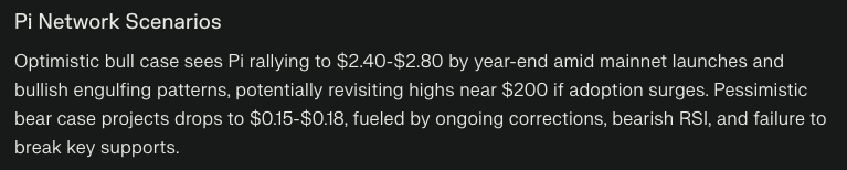 According to Perplexity AI, Pi faces two extreme outcomes. In a negative scenario, the model warns PI could fall all the way to $0.15. Conversely, under strong bullish conditions in December, PI could surge toward $2.80, representing a potential upside of more than 1,279% from current levels.