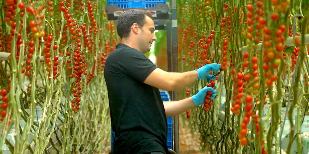 man in netherlands greenhouse surrounded by ripe red tomatoes
