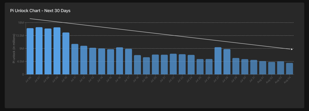 Daily token unlocks for Pi will remain quite high until July 10, meaning that the selling pressure could accelerate this week until the rate at which the token’s supply is increasing decelerates.