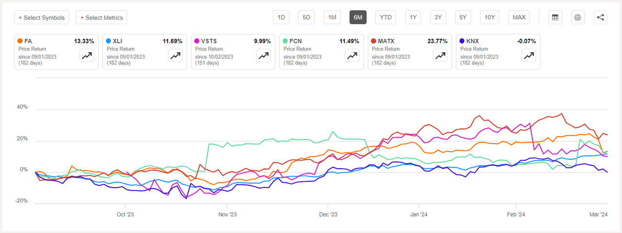The chart below shows 6-month price-return performance of the worst five decliners and XLI: